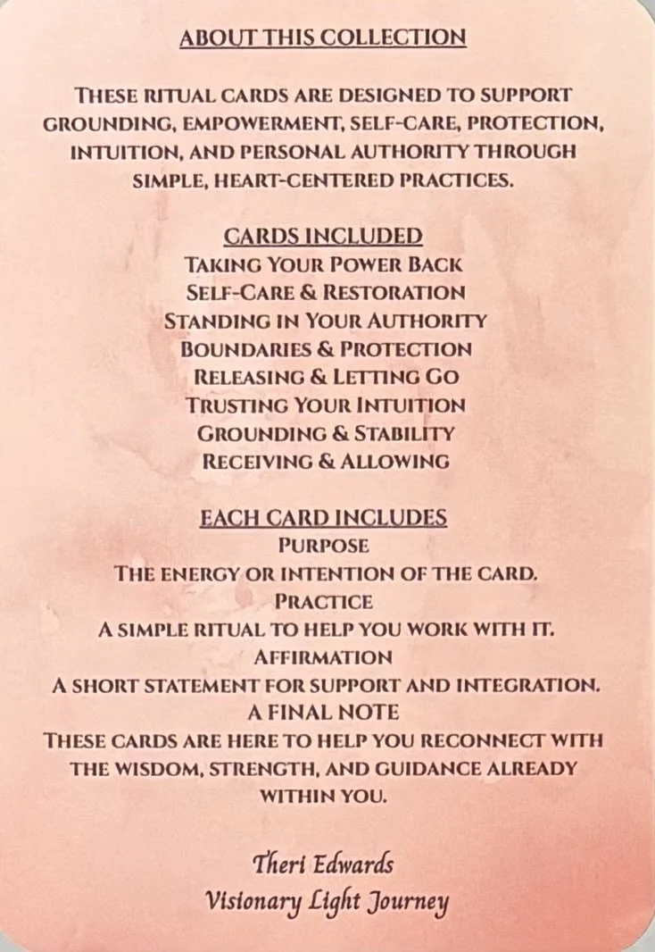 Each card holds a clear, focused intention—guiding you back to yourself through grounding, self-care, protection, intuition, and personal empowerment.